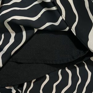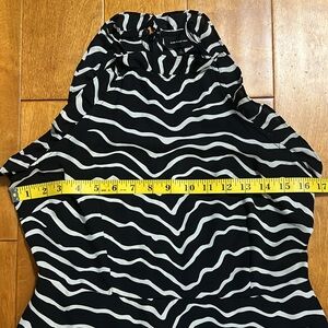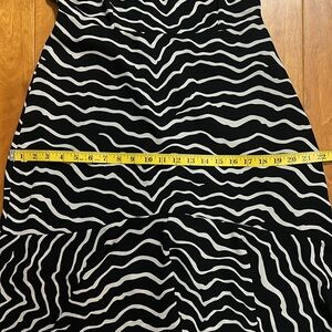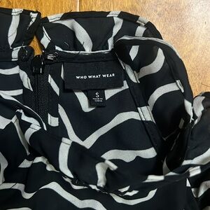Elevate your evening look with this striking black and white fit and flare dress from Who What Wear. Featuring a sleeveless halter neckline, this cocktail-ready midi dress boasts a dynamic zebra-like pattern that adds a modern twist to classic animal prints. Its structured fabric ensures a flattering silhouette, making it a standout choice for a night out.