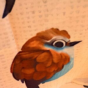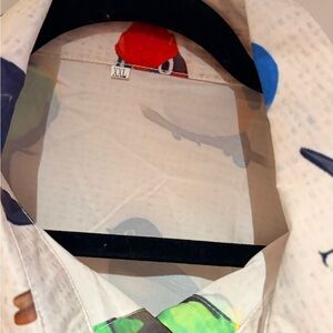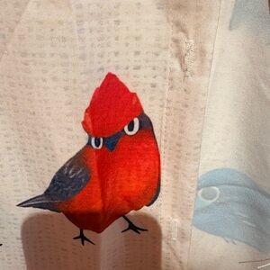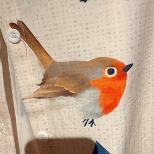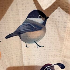 Stylish long-sleeve shirt featuring a white base with vibrant multicolor bird prints. Soft, breathable fabric for comfortable wear. Eye-catching design highlights blue, red, orange and brown bird motifs. Versatile piece that adds playful character to any outfit.