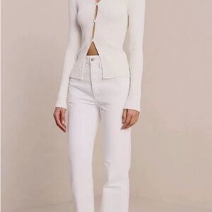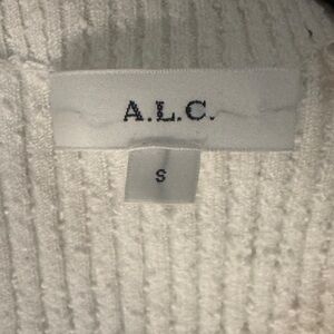 A.L.C. Miller rib knit cardigan in white. The long sleeve cardigan features a V-neckline, button-up front, and solid pattern. It is made of a blend of nylon and viscose, with a knit fabric type that adds texture and depth to the garment. Perfect for any occasion, whether it's a casual day out or a formal event, this cardigan is a must-have for any fashion-forward woman. Its timeless design, combined with the ribbed texture, makes it a unique and stylish addition to your wardrobe.