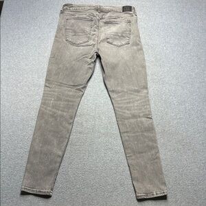 American Eagle Ne(x)t Level Stretch skinny jeans offer a comfortable, flexible fit with a high-waisted silhouette. These Real Good jeans are crafted from a soft cotton blend with a faded grey wash, featuring classic five-pocket styling and a zip fly with button closure. The fabric provides excellent recovery and shape retention for all-day wear.