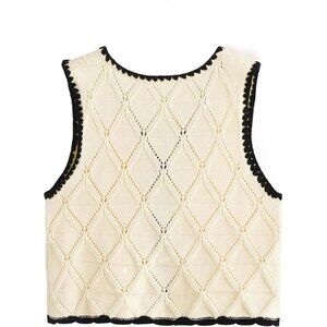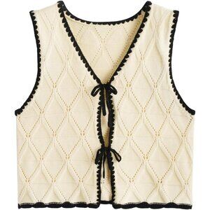 Features: Soft, stretchable acrylic vest with a flattering V-neck and sleeveless cut. The contrast binding adds a subtle pop, while the tie front makes it easy to adjust for a comfy fit. Hollow out design lends a stylish touch, perfect for layering.