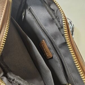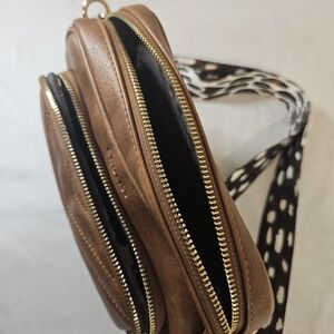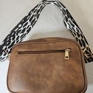 brown quilted crossbody bag with gold hardware. Versatile front zip pocket and roomy main compartment for everyday essentials. Adjustable patterned strap for comfortable, hands-free wear. Sophisticated brown leather-look finish pairs easily with casual and dress outfits.