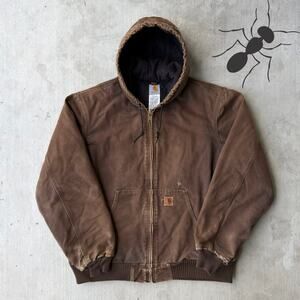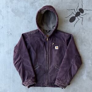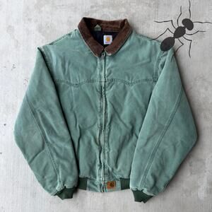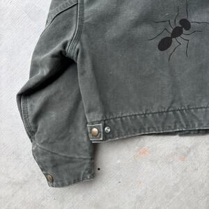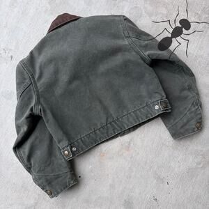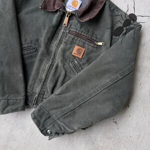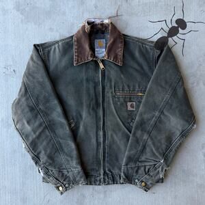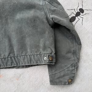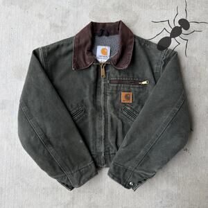Carhartt YOUTH YJ97 MOS green Detroit work wear jacket. Great one! Light fade. Few small marks throughout. Measures 16.5x15.5. Please check measurements before purchasing. I do my best to show any flaws in pictures. Quick shipping! Bundles encouraged!