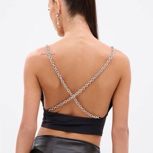 No contest. The AKIRA Label Better Than Your Ex Rhinestone Top is a cheeky crop top crafted from a smooth and stretchy, curve-hugging material. It features silver-tone chain link shoulder straps that cross at the open back and the phrase "BETTER THAN YOUR EX" printed prominently in rhinestone-embellished block letters across the front.