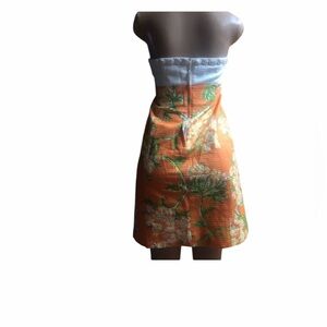 legant strapless dress with a white top and orange floral design. Ideal for sunny days.