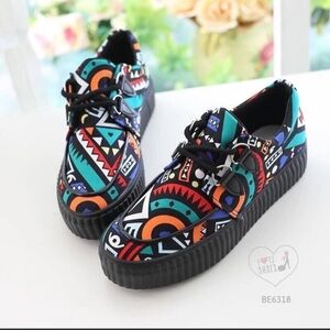Bohemian canvas platform sneakers feature a vibrant geometric pattern and a thick rubber sole.