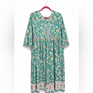Lightweight green dress with all-over floral print. Relaxed midi silhouette with a V-neck. Pom trim accents at waist and sleeve edges. Short bell sleeves and a decorative hem border. Feminine and easygoing for daytime wear.