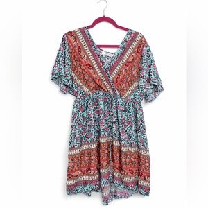 Lightweight wrap-style dress with a tiered skirt and flutter sleeves. Features an aqua base with coral and rust floral and border prints. Comfortable elastic waist for a flattering fit. Easy-to-wear, colorful dress perfect for warm-weather outings.