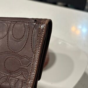 Coach Dark Brown Embossed Signature Leather Wallet with Gold Snap