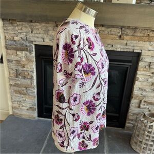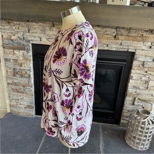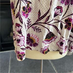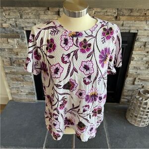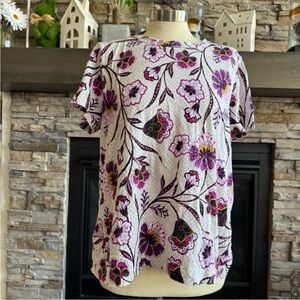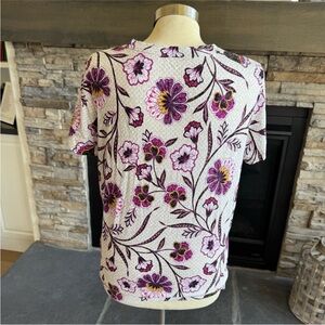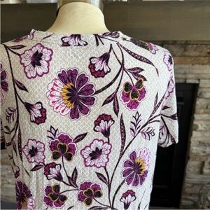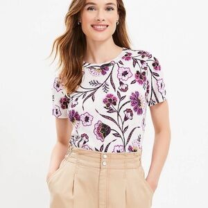 This fitted t-shirt from LOFT features a vibrant pink and purple color palette, offering a stylish and comfortable option for any casual outing. The short sleeves and lightweight fabric make it perfect for warm weather, while the fitted design adds a touch of elegance to your look.