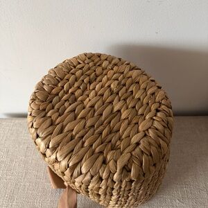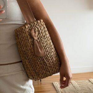 Handcrafted woven straw tote with a brown ribbon handle. Lightweight and easy to carry for everyday essentials. Neutral color pairs well with casual and summer outfits. Simple, versatile design that complements many looks.