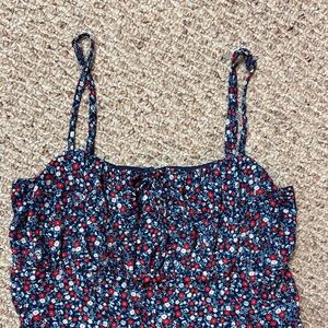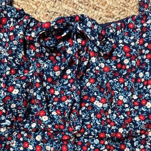 Chic red, white, and blue floral romper with spaghetti straps. Lined, zipper closure, ruffle bottom, adjustable straps. Perfect for a fun young lady!!