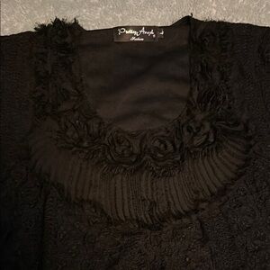 Elegant black lace top with short sleeves. Features layered ruffle neckline. Sheer lace overlay and pleated ruffle hem. Feminine and dressy style for events or evening wear.