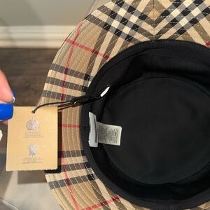 Classic Burberry hat with signature check pattern. Features a black interior.