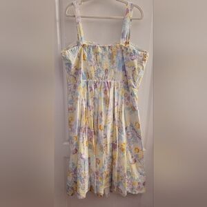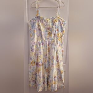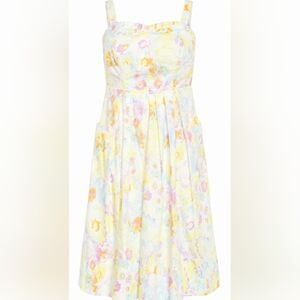 Sleeveless midi dress with a flattering fit-and-flare shape. Square neckline and pleated skirt. Soft pastel floral print in multi hues. Feminine and breezy for daytime events.