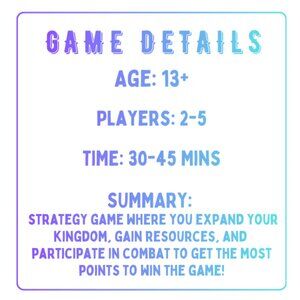 Summary: A strategy game (13+) for 2-5 players where you expand your kingdom, gain resources, and participate in combat to get the most points to win the game!
