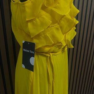 Maison Tara One-Shoulder Ruffle Midi Dress in Bright Yellow