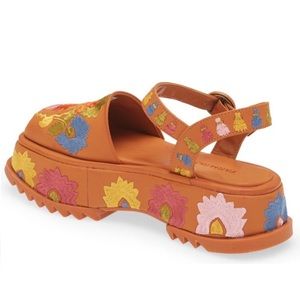 Colorful embroidery enlivens this tropical-inspired shoe set on a serrated platform sole for even more texture.