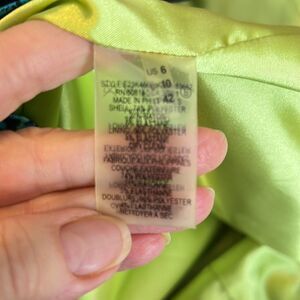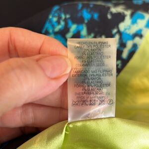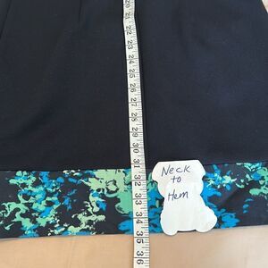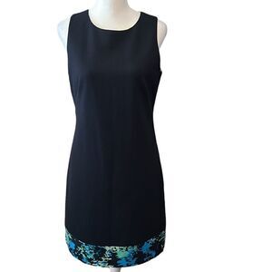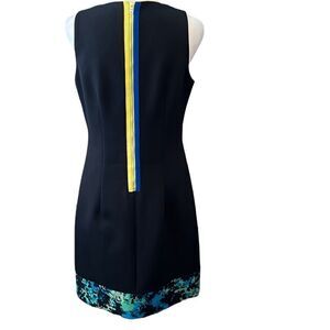 T Tahari navy blue sheath w/print band green & blue zipper & green lining