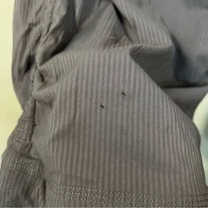 Two tiny stains at the bottom of one leg. Haven’t tried removing. Lighter in person.