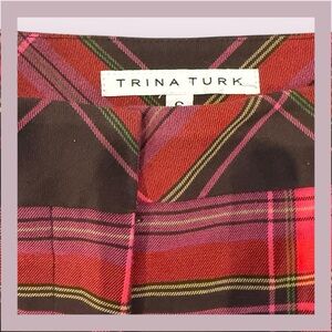 These Trina Turk feature a classic plaid pattern in a bold red, brown, and pink colorway, with a flattering slightly flared, straight-leg cut. They include a center front zip with a trouser hook closure and side slash pockets.