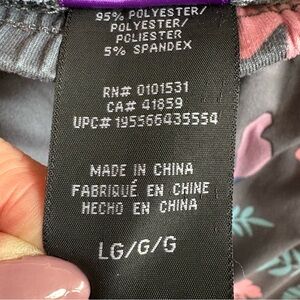 Soft lounge pants with all-over tropical leaf and hibiscus print. Features repeated blue cartoon character faces. Elastic waist with drawstring. Comfortable relaxed fit for lounging or sleepwear. Polyester/spandex
