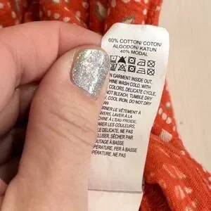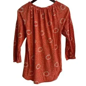 Peasant-style blouse features a vibrant orange sunburst medallion print on a soft cotton-modal blend fabric. Designed with a split neckline and tie detail, this top offers a relaxed fit with 3/4 length elastic-cuff sleeves and a flattering curved hem. This item is in excellent pre-owned condition with no visible flaws.