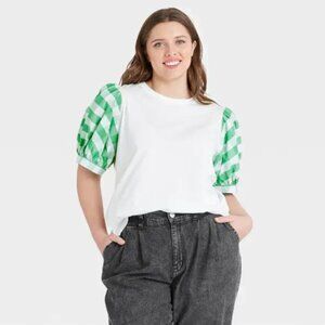 Make a statement with this stylish and playful top from Who What Wear! Features a classic white bodice with eye-catching green gingham puff sleeves that add a bold, feminine touch.