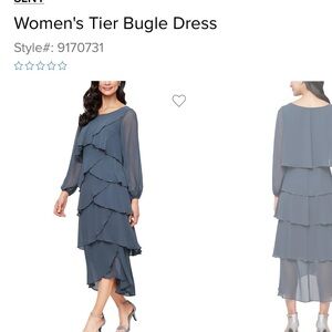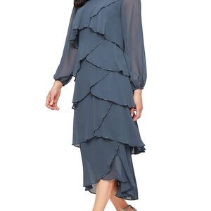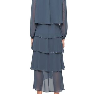 SLNY layered chiffon dress with cascading tiers. Sheer long sleeves and rounded neckline. Flowy high-low hem for movement. Subtle, elegant eveningwear look.