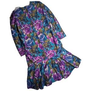 Green, purple, and teal floral print lightweight felt drop waist midi dress with long sleeves, shoulder pads, a ruffle hem, and Talon back zip. No brand marked, vintage circa the 1980s and possibly handmade. Excellent gently used condition. Best fits up to modern size 10 according to measurements, please review prior to purchase.