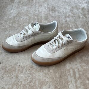 Low-profile Nike sneakers in white leather and suede. Gum rubber outsole for traction. Padded collar and cushioned footbed for comfort. Clean, versatile silhouette for daily wear.