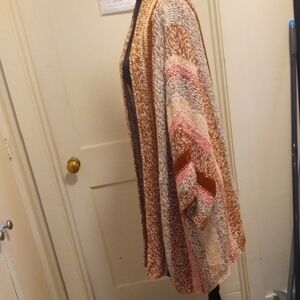 Cozy open-front cardigan with vertical stripes in pink, cream, and brown.