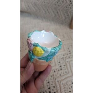 Charming pair of ceramic salt and pepper shakers designed to look like miniature terracotta flower pots overflowing with colorful spring blooms. Each shaker features hand-painted 3D floral details including pink tulips, yellow blossoms, and blue forget-me-nots nestled among green leaves. The tops have a scalloped, eggshell-like edge, while the bases retain their original plastic stoppers. Perfect for a garden-themed kitchen or a cheerful Easter brunch table setting.