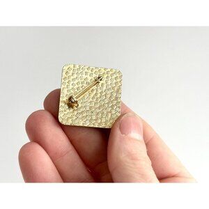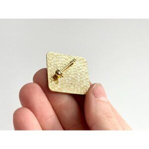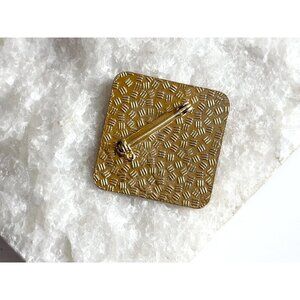 Gold toned vintage square shaped floral brooch. The brooch features two pretty orange / reddish flowers with a white and pink background. Gold toned, textured on the posterior.