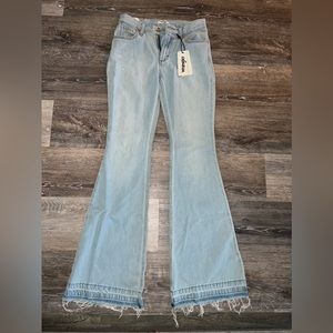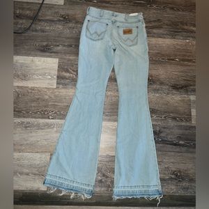 Stylish Wrangler flare jeans. Light blue color. Frayed hem for a trendy look.