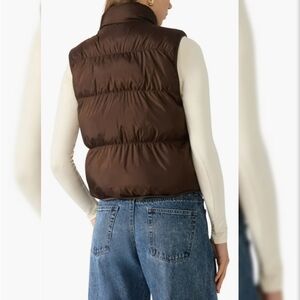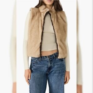 Zipper close puffer vest with chocolate brown nylon on one side and super soft faux fur on the other. Reversible! Pockets on both sides