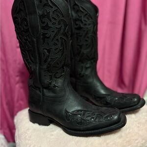 Elegant black heeled boots with intricate detailing. Perfect for a stylish look.