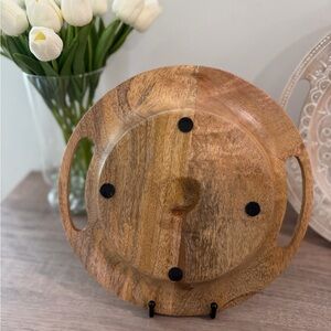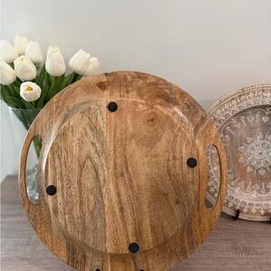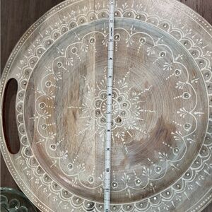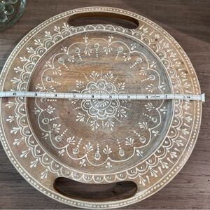 This hand-crafted round wooden decorative tray is one-of-a-kind with a hand-painted whitewashed finish and cutout handles.
