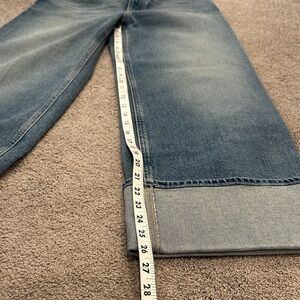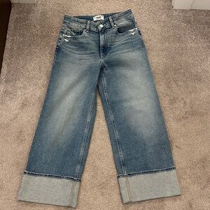 Classic light to mid blue denim jeans with a wide cuff detail. Straight leg cut. Simple five-pocket styling. Versatile everyday denim. Like new.