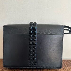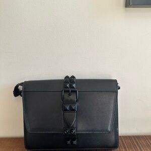 Elegant black crossbody bag with studded detail. Perfect for versatile styling.