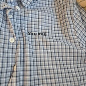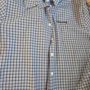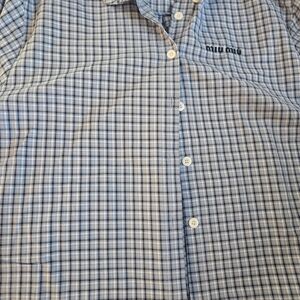 Stylish blue plaid button-up shirt by Miu Miu. Features a classic collar and button closure.
