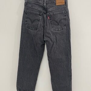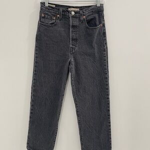 Classic Levi's jeans with a ribcage straight ankle cut. Dark gray color. Timeless style.