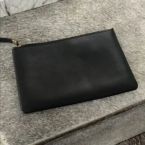 Sleek black leather clutch. Features a gold zipper. Perfect for any occasion.