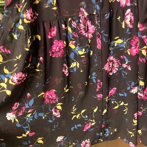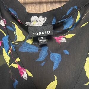 Torrid size 2 black floral dress with a soft, flowy silhouette and romantic sheer overlay. Features long sleeves, button front detail, and a flattering high low hem. Black background with vibrant pink, blue, and yellow floral print. Lightweight polyester fabric. Approximate measurements: pit to pit 25”, waist 26” across, length 39”. Preowned in good condition with no major flaws noted. See photos for measurement details.