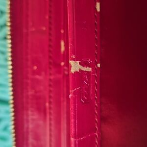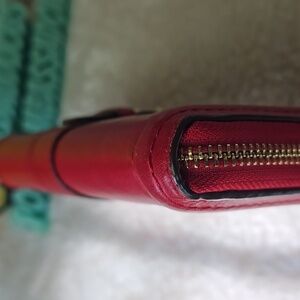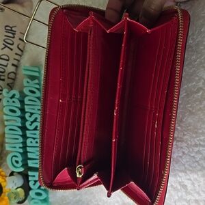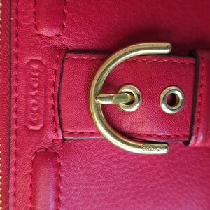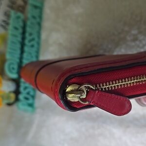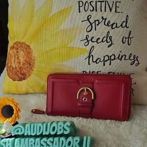 Coach zip-around leather wallet in vibrant red. Features a decorative gold-tone buckle and hardware. Sleek, practical design with multiple compartments. Classic Coach branding on the front. Call outs inside get leather paint and boom fixed!