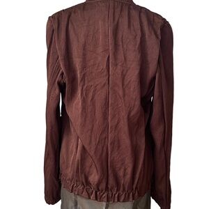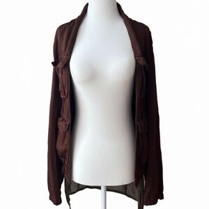 The jacket features a rich brown triacetate fabric with subtle texture, raw-edge finishing, and distinctive multi-pocket utility detailing across the front. The open-front design and structured stand collar create a relaxed yet architectural silhouette, while the sheer olive-toned layered hem panel adds contrast and depth.