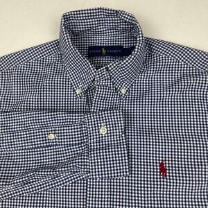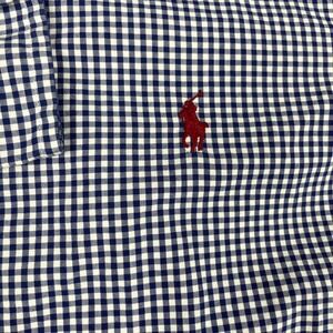 Ralph Lauren button-down shirt in a classic navy blue and white gingham pattern. Crafted from breathable cotton, this long-sleeve top features a button-down collar and the signature red pony embroidery on the chest. The curved hem and adjustable button cuffs provide a polished look suitable for both casual and professional settings.