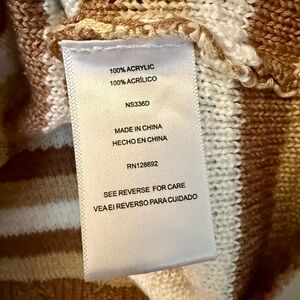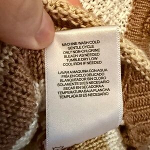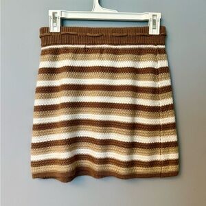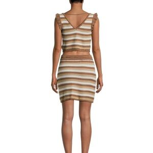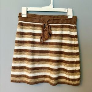 Madden NYC two-piece striped knit set with crop V-neck top and matching skirt. Soft knit fabric with drawstring waist and tassel ties. Neutral white, brown and camel stripes.