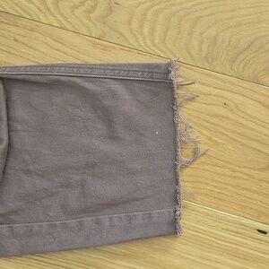 High-rise fit with wide legs. Cropped and cut at bottom with fringe for modern style, altered, front and back pockets, brown color.
