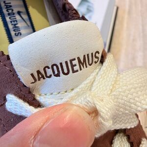 Stylish Jacquemus sneakers in brown and white. Features a sleek design with a comfortable fit. Brand new size 10 men & 11.5 women - comes with box, dust cover, and ribbon accessory. Purchased directly through retail. Hard to get collection